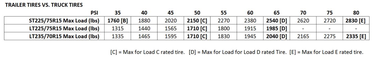 As you can see light truck tires do not have as much load carrying capacity as a similarly sized trailer tire because they are designed to carry more weight using larger cords in the construction of the plies and the belts.