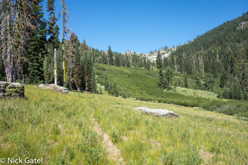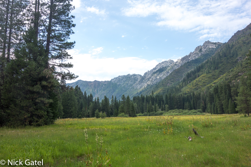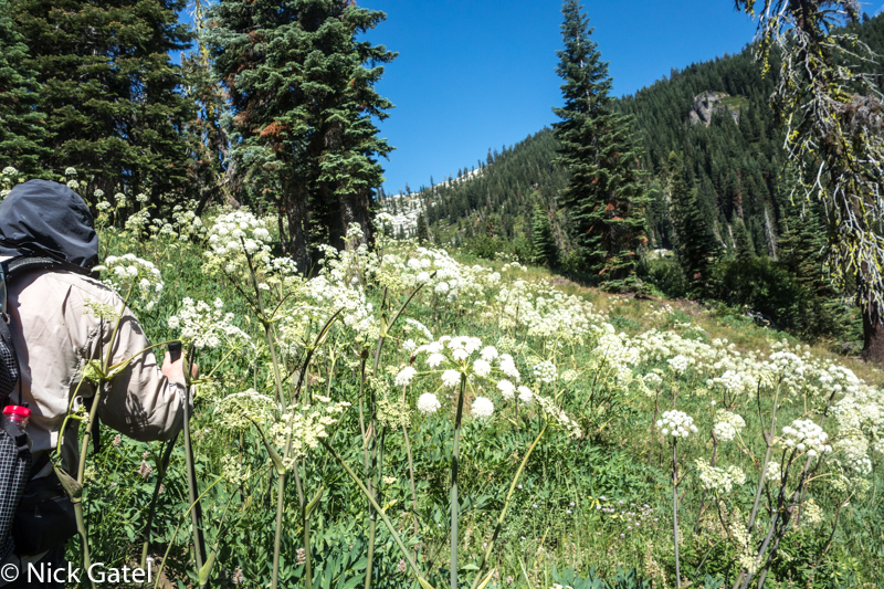 We left our vehicles at the Big Flat trailhead and began our hike around 8am crossing the South Fork of the Salmon River. We would gradually gain about 2,000 feet of elevation over eight miles and then drop down into the Caribou Lakes basin for a total of nine miles for the day. The first four miles are a gradual incline walking up long switchbacks in a shady conifer forest and most of time Caribou Mountain isn’t visible from this section of the trail. At about the halfway point, we took a snack break at Caribou Meadow. Once we left Caribou Meadow, the trail steadily gained elevation as it hugged the flank of Caribou Mountain.