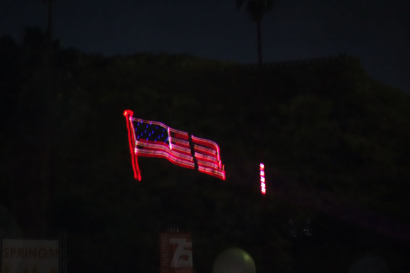 A little before 8 pm the Laser Show and Fireworks started. I have never seen a laser show and I suppose the 1,000 tall section of mountain made for a better background than most people get to see. Fireworks were going off at the same time, and I have to admit it was the best fireworks display I have ever seen. Although it was dark, at times the mountain was lit up by the fireworks behind the laser beams. We had about 20 minutes of sensory overload — music synced to the laser show and fireworks — all happening at once. I have to say, it was very impressive.