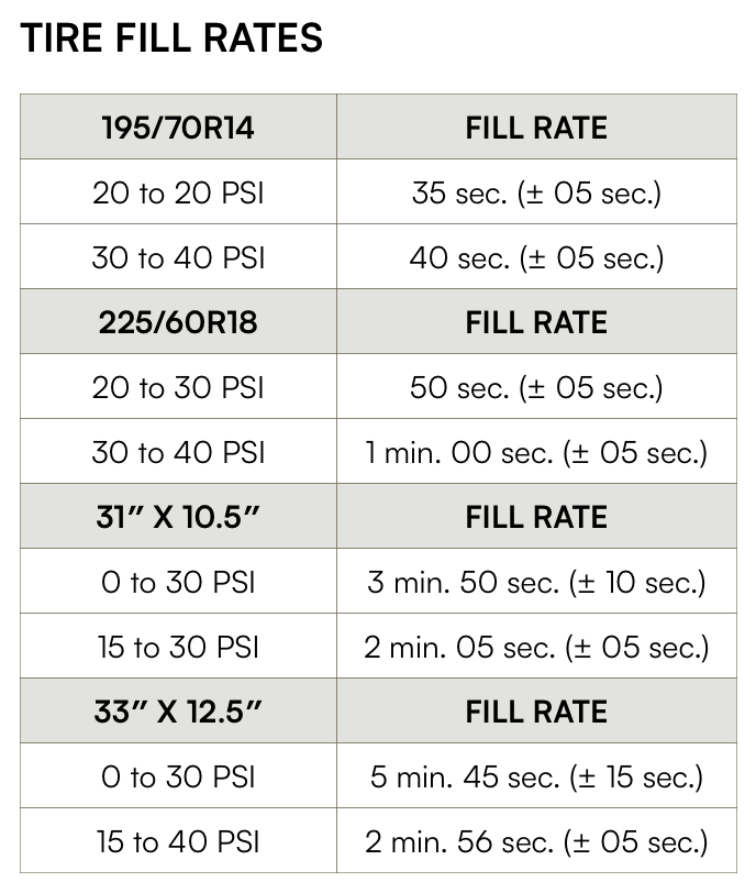 Duty Cycle: Designed for a 25-minute continuous run at 30 PSI before needing a break to cool down, so it’s capable of inflating multiple tires with short pauses.