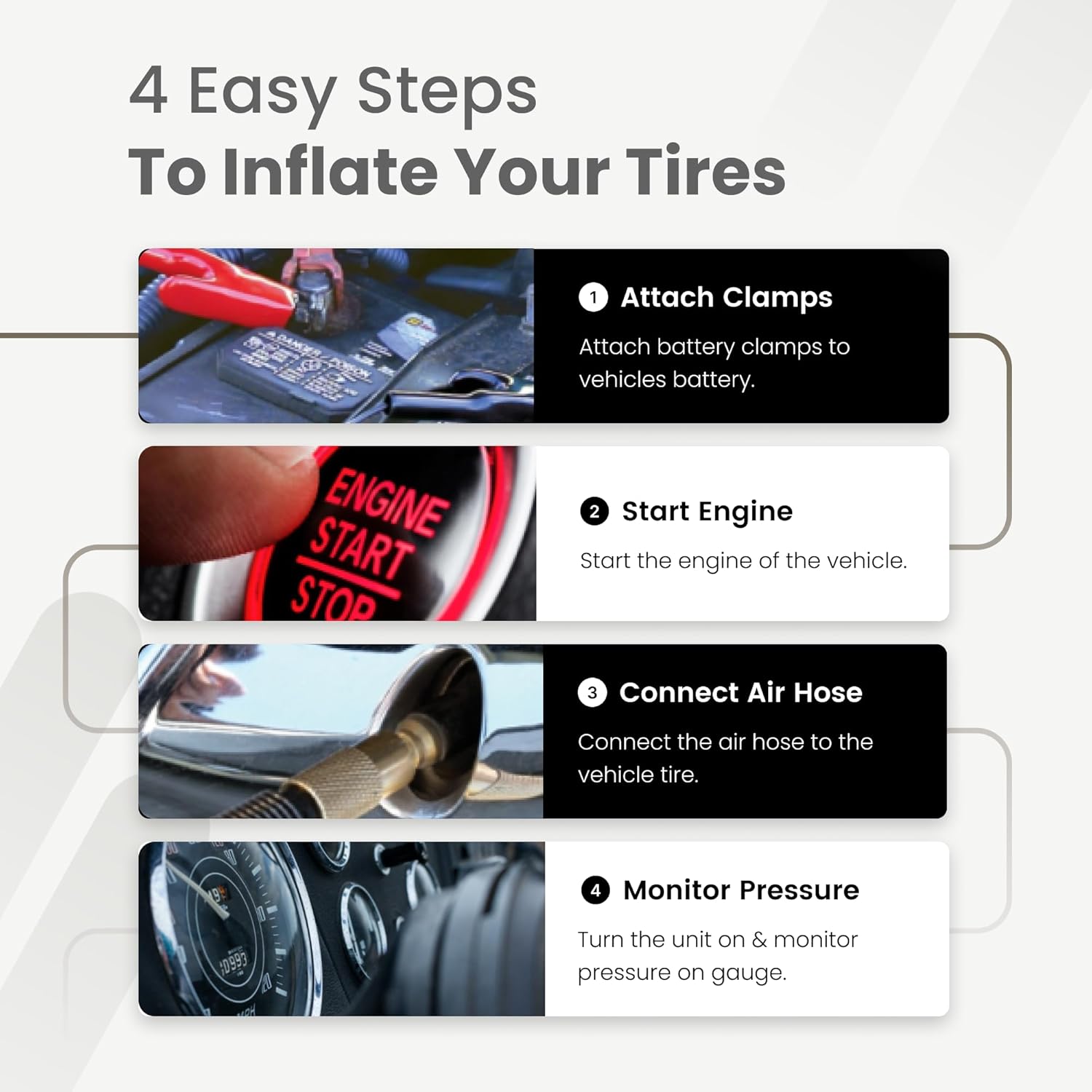 Power & Pressure: Runs off the vehicle battery and delivers up to 120 PSI with an airflow of 1.97 CFM @ 0 PSI, enough to inflate tires up to 33″ in diameter.