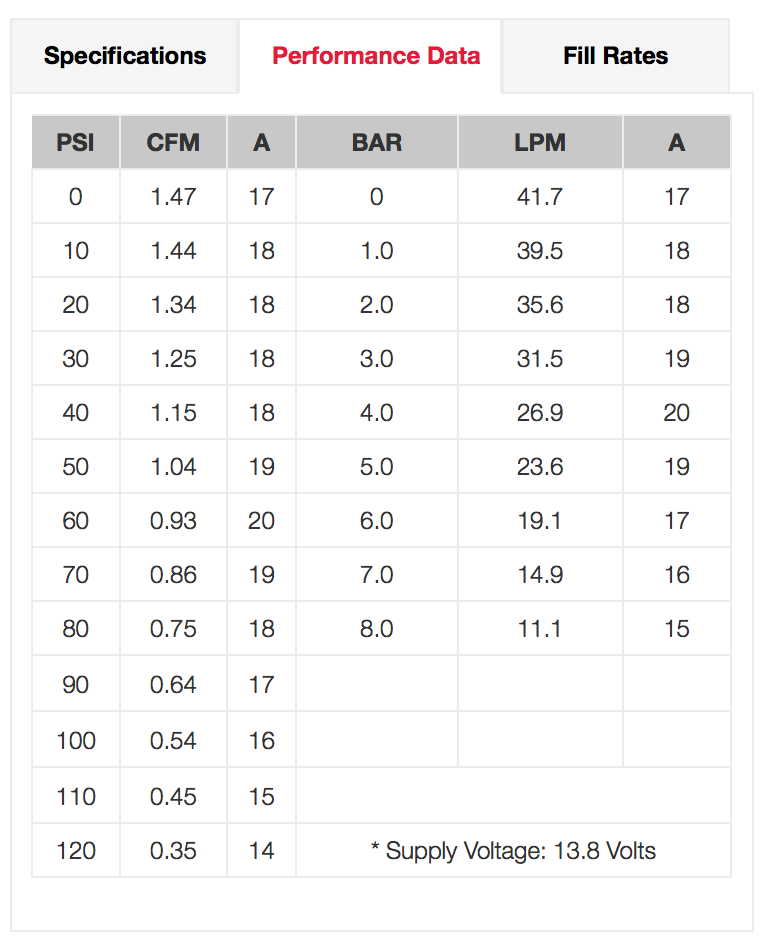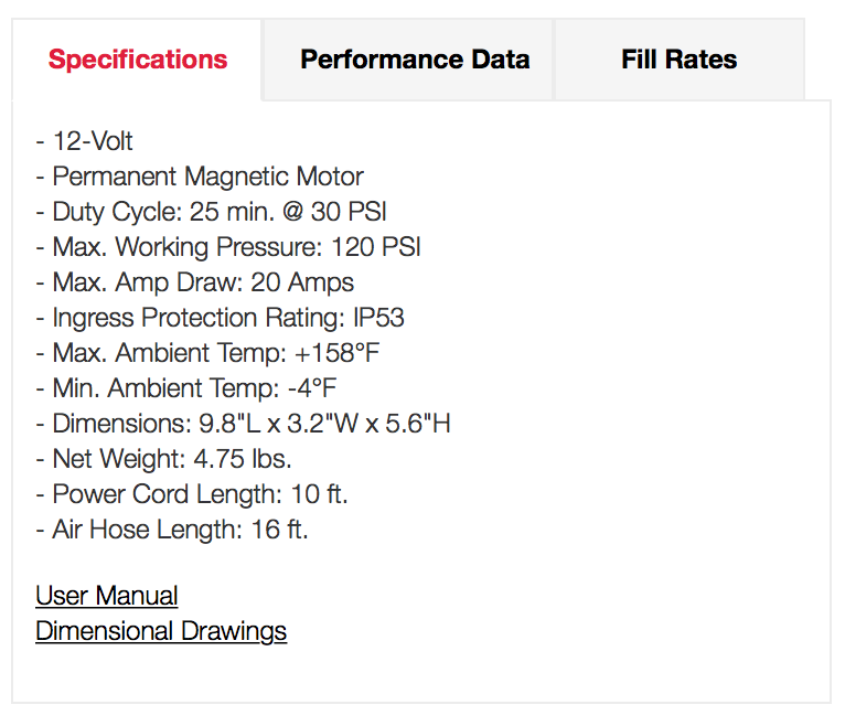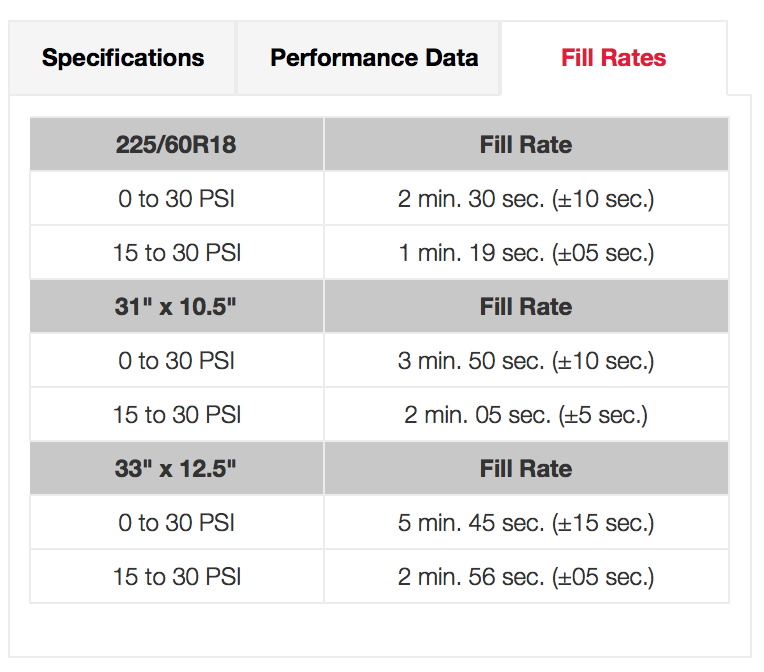 I don’t just go to Amazon and buy things. Other research is needed to make informed decisions. A tour through the VIAIR website was helpful, although we must always remember product websites are marketing venues. Here are the specifications, performance data, and fill rates for tires.