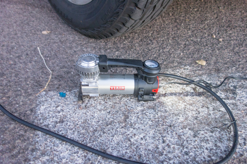 The tires on the SUV and trailer are checked before every trip. At home the portable compressor isn’t used. In our garage a 33 gallon air compressor resides along with a 50′ air hose and a quality air chuck with gauge.