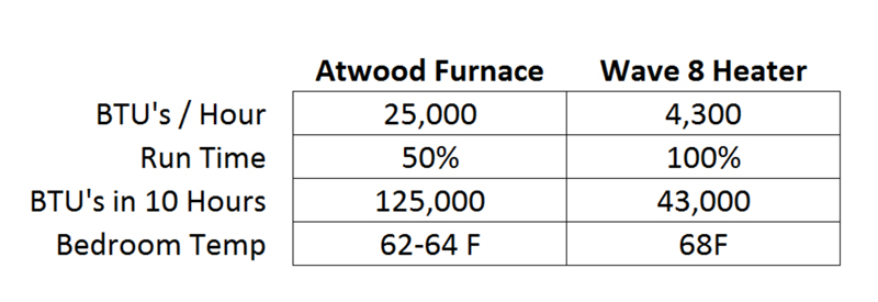 Because the Wave produces radiant heat we can set the heater in front of the bedroom doorway and only the bedroom is heated. Plus the heat is constant, with no swings in temperature like the furnace that cycles on and off. The only downside, if there is one, is that the Wave runs 100% of the time. However, with the wave set at low with an outdoor temperature of 30F, the bedroom stays at a constant 68F. So let’s do a comparison chart, and assume we heat the camper for 10 hours at night.