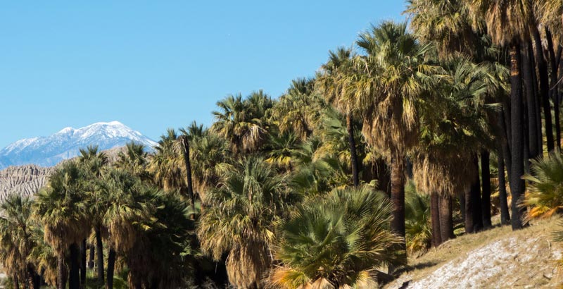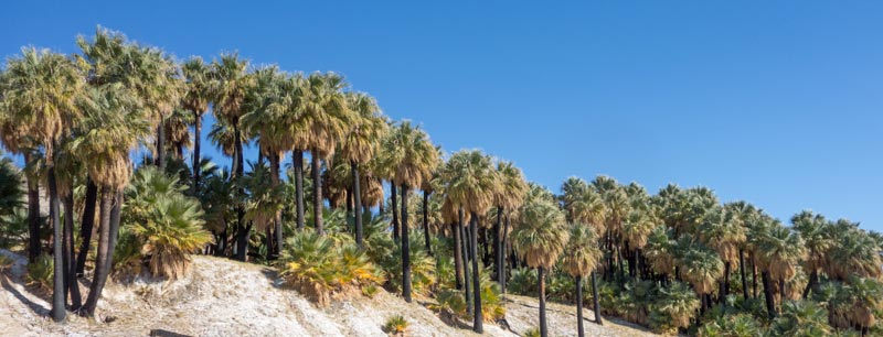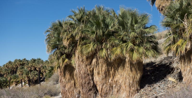 I live in a large valley named the Coachella Valley. In some of our canyons there are palm oases where native Washingtonia Palm trees grow. There are several of these oases in the eastern part of our valley. These palms need a lot of water, which is supplied by undergrounds springs created by the San Andreas Earthquake fault.