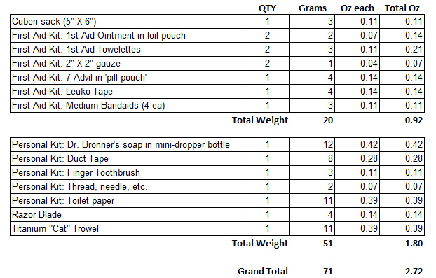 Many hikers buy pre-packaged kits with all kinds of stuff they may not know how to use, or will never need. If you are skilled, not over weight, and pack light the only first aid you will normally need is treatment of minor scrapes and cuts. For major injuries most can’t treat themselves anyway. Foam pads, bandannas, and other non-medical items in your back can often do double duty in emergencies. Many folks say that these heavy pre-packaged first aid kits give the hiker peace of mind — I would argue they give the hiker a false sense of security.
