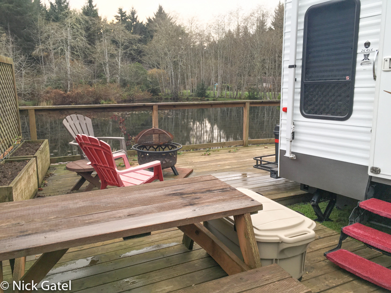 The wood deck really turned out to be a great amenity. The ground was soaked from all the rain and we were even able to BBQ on the deck. Below is the deck and included amenities (the plastic tote is ours and contains our Baby Q grill)…